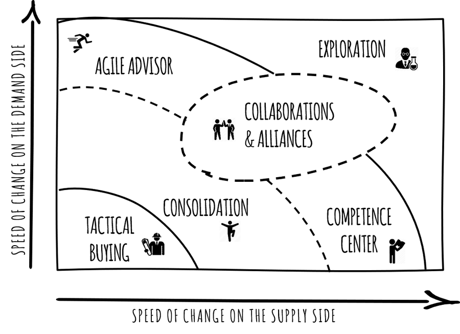 This framework describes six work modes that Purchasing Organizations need to master. The six work modes are based on the speed of change and on both the demand and the supply side.