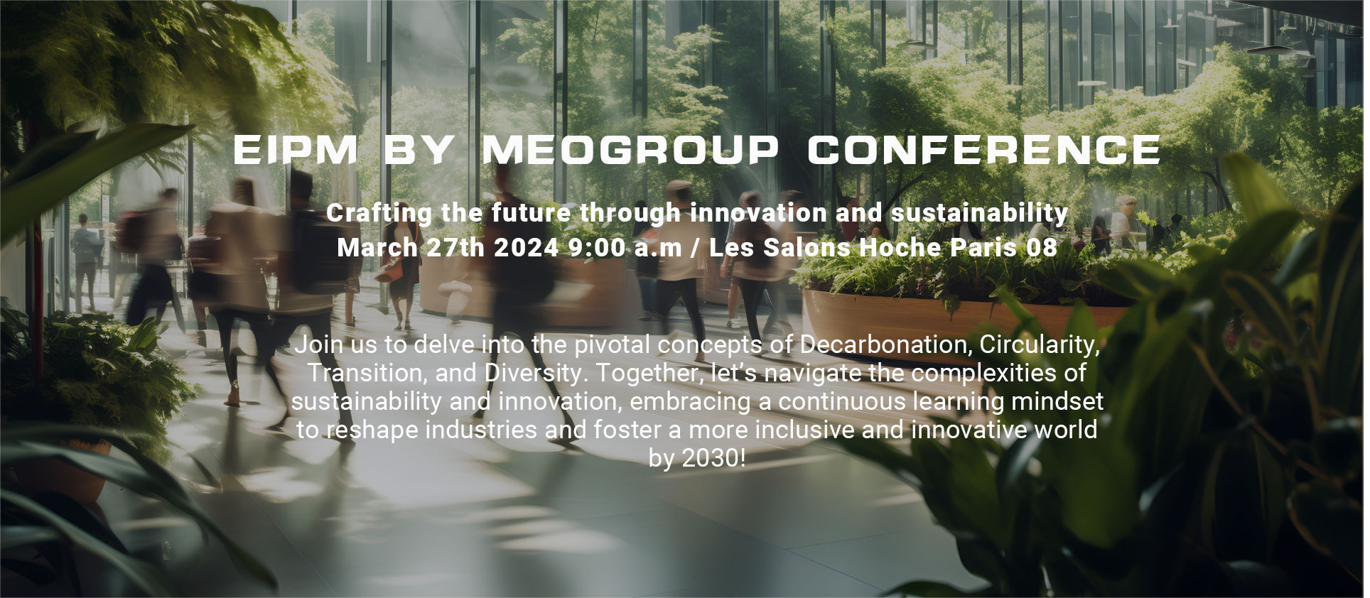 March 27th 2024 9:00 a.m I Les Salons Hoche Paris 08, France CONFERENCE DAYFreeJoin us to delve into the pivotal concepts of Decarbonation, Circularity, Transition, and Diversity. Together, let’s navigate the complexities of sustainability and innovation, embracing a continuous learning mindset to reshape industries and foster a more inclusive and innovative world by 2030!